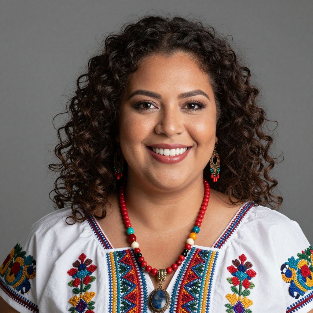 Thick Latina woman standing confidently on a colorful city street at sunset, wearing vibrant traditional clothing with intricate patterns, surrounded by lush tropical plants and warm golden light, detailed digital art style.