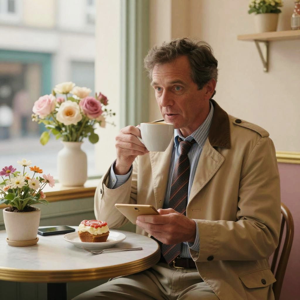 Photograph of a middle-aged white man with wavy brown hair, wearing a beige trench coat, blue striped shirt, and dark tie, sitting at a small round table in a brightly lit café. He holds a white cup in his right hand and a smartphone in his left, looking slightly surprised. On the table, there's a plate with a cupcake topped with red icing and a small bouquet of flowers in a white pot. Behind him, a window allows natural light to stream in, illuminating pink and white flowers in a larger vase on the window sill. The background is softly blurred.