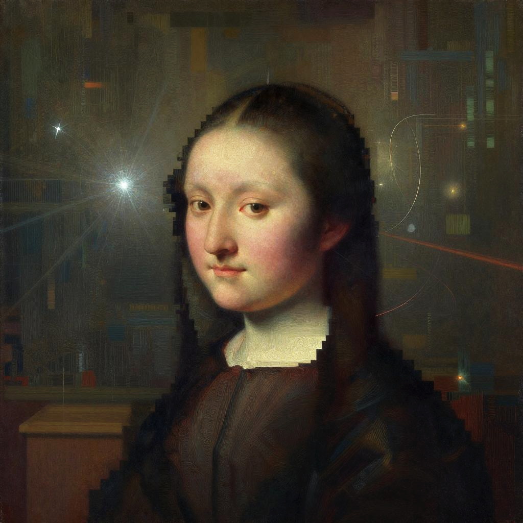 Ai change image artistic style transfer, a traditional painting transforming into a futuristic digital artwork, intense color shifting with pixelated edges dissolving into glowing fractals, expressive and visually captivating, blending classic and tech aesthetics