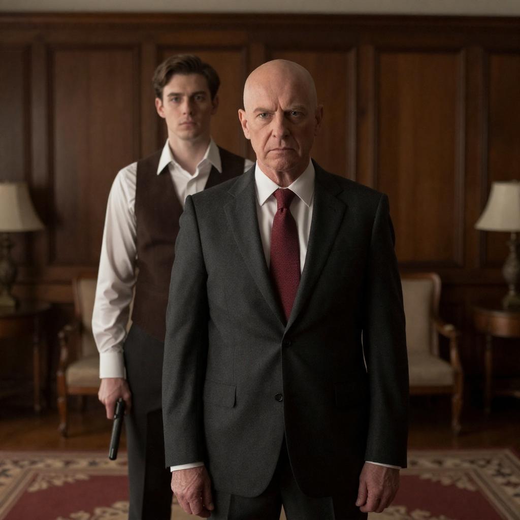 Middle-aged man in brown suit holding rifle, standing in room with American flag, framed pictures, and military flags on wall. Patterned wallpaper, lamp, and couch in background. Serious expression, bald with light skin, holding gun with both hands.