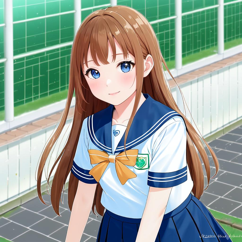Anime-style illustration of a young girl with long brown hair and blue eyes wearing a Nami Junior High School serafuku (sailor uniform). She is depicted outdoors on a paved path beside a green fence. The uniform features a white top with navy blue collar and trim, an orange bow at the chest, and a navy blue pleated skirt. The girl has a gentle, shy expression on her face.