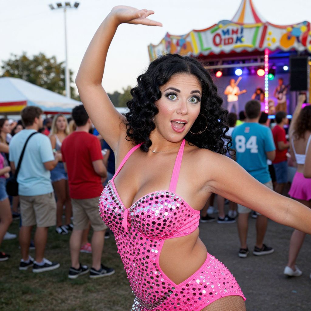 Photograph of a curvy woman with medium-sized breasts, olive skin, and black curly hair, striking a dance pose at a colorful outdoor carnival. She wears a hot pink, sequined, halter-neck bikini with cut-out sides, and large hoop earrings. Her wide, expressive eyes and open mouth add a surprised or playful expression. The background features a brightly lit, colorful carnival booth with "Fun-O-Drome" signage, and a crowd of casually dressed people in shorts, t-shirts, and sneakers. White tents and vibrant lights enhance the festive atmosphere. The image is vibrant with high contrast and a slightly exaggerated, almost cartoon-like style.