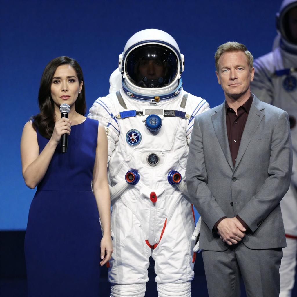 Photograph of three performers on stage. The left performer, a white male with white face paint and red lipstick, holds a microphone. The middle performer, a white female with a pink shawl and silver jewelry, smiles. The right performer, a black female with a red headscarf and patterned dress, looks to the side. Background features red and blue draped curtains.