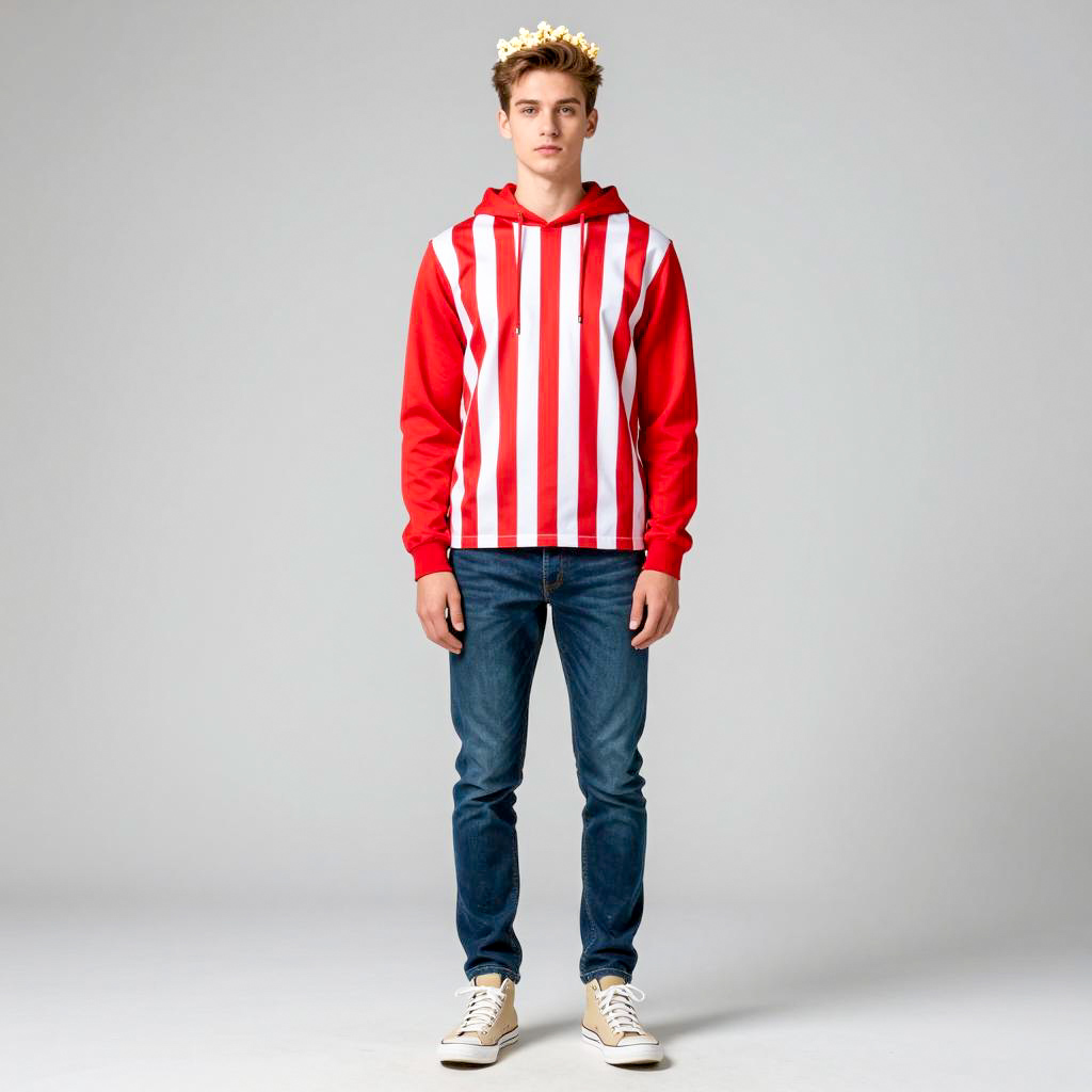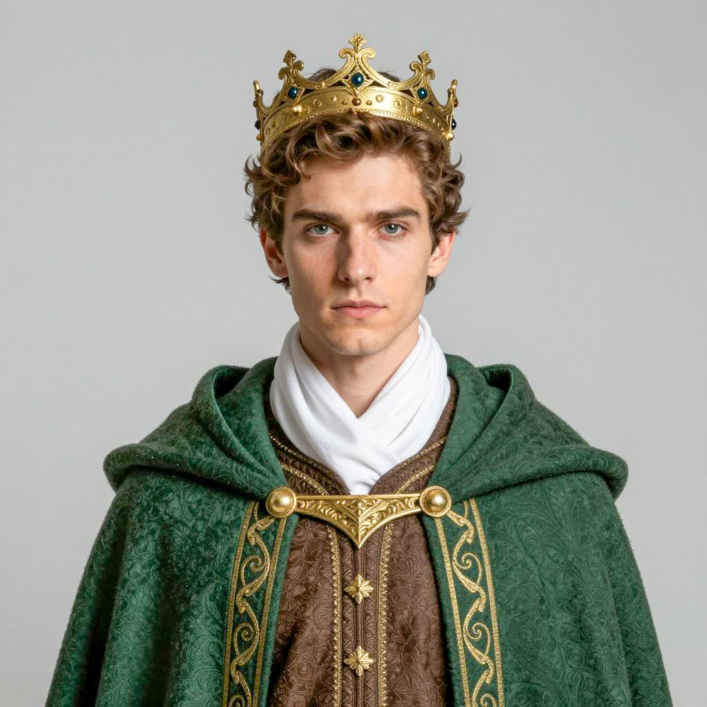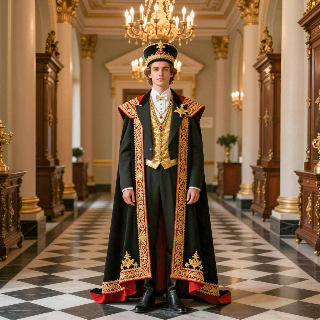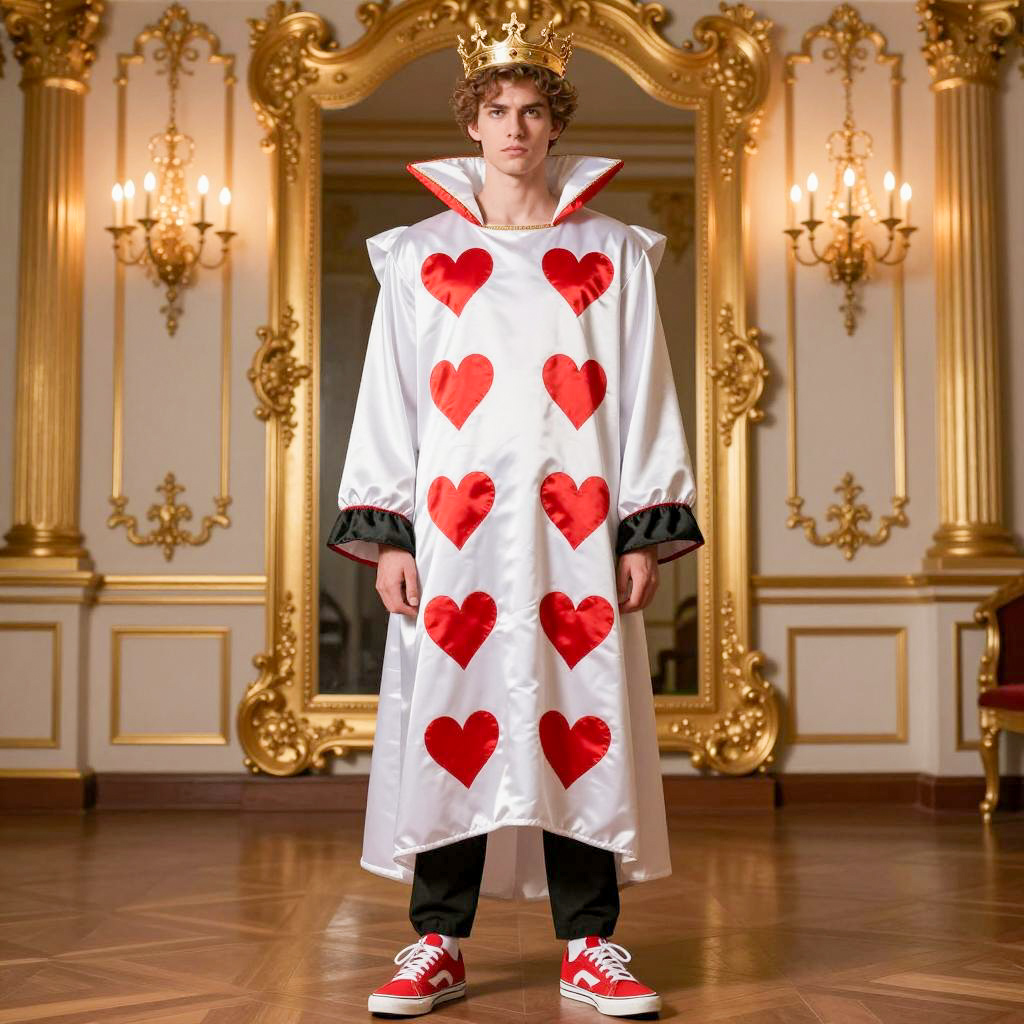 Queen hearts costume shirt, photorealistic, young man, standing, royal outfit, white satin robe, red hearts, black cuffs, red sneakers, gold crown, ornate background, golden frames, chandeliers, serious expression, regal, symmetrical composition, centered, formal setting, detailed ures, high contrast, realistic lighting, fantasy theme, medieval-inspired, symmetrical golden frame, elaborate decor, polished wood floor