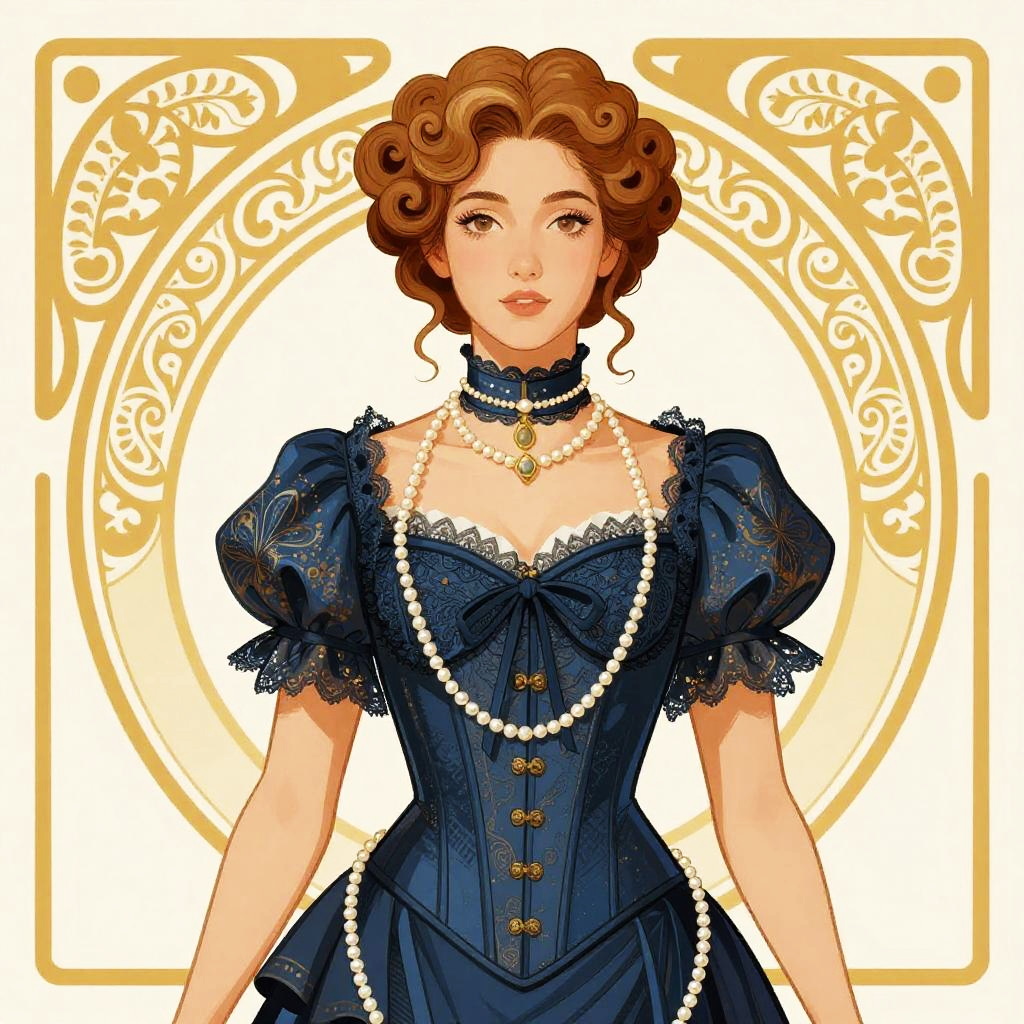 A digital illustration of a woman dressed in a detailed, dark blue Victorian-inspired corset outfit adorned with pearls and lace. The artwork features a stylized hairdo with precise curls and an elegant, symmetrical background with ornamental golden patterns, reflecting an Art Nouveau influence.
