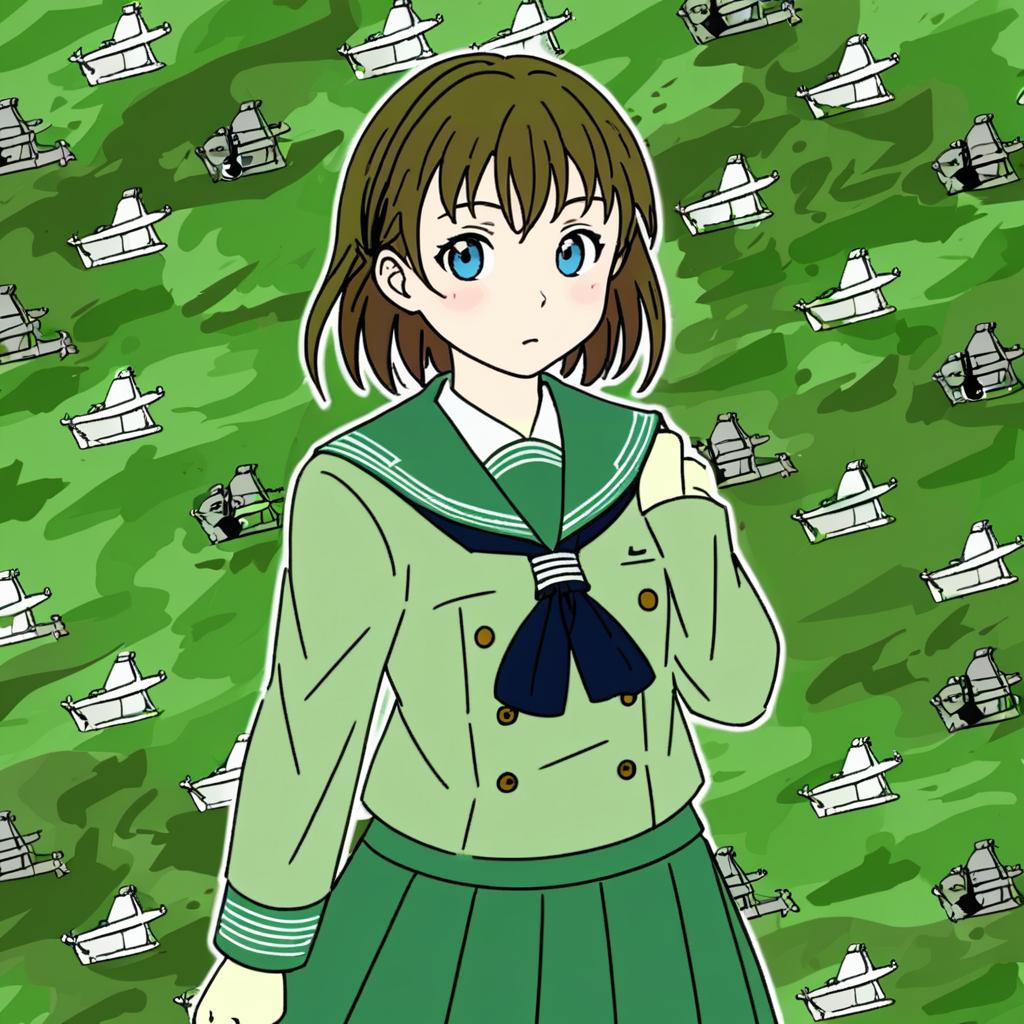 Hachijou (kancolle), kantai collection, 1girl, blue eyes, short hair, brown hair, hair ribbon, serafuku, green jacket, green skirt, pleated skirt, serafuku, black ribbon, long sleeves, green sailor collar, by artist hyakumangoku masurao, anime