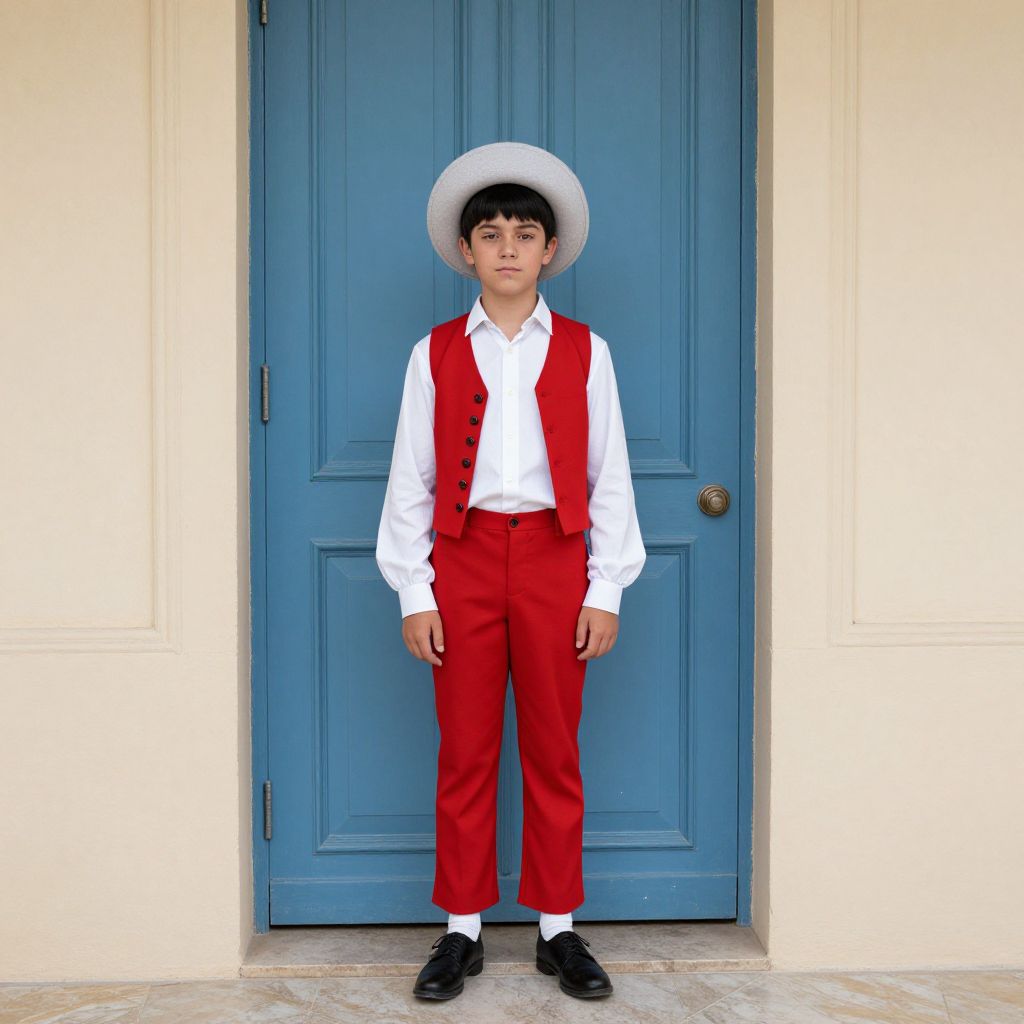 Photograph of a young boy with dark hair, wearing a white hat, white shirt, red vest, red pants, white socks, and black shoes