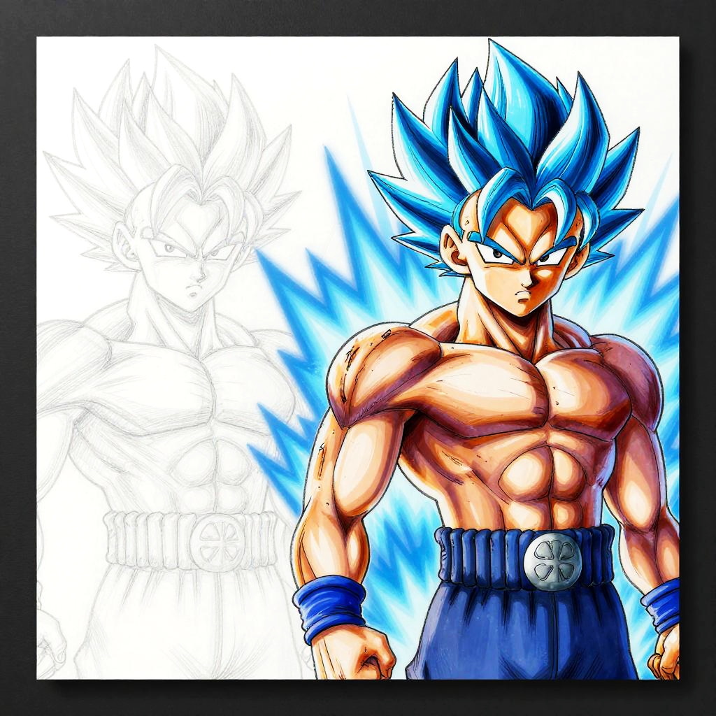 How to draw Gogeta Blue with stepwise layers, starting from rough pencil sketch to inking, coloring with vibrant blue gradient hair, shadowed skin tones, fierce battle-ready expression, and glowing energy effects, set on a simple dark backdrop for focus.