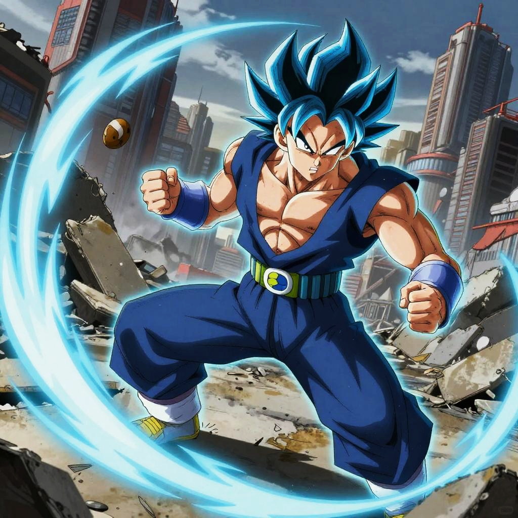 Digital anime-style drawing of a muscular, shirtless Super Saiyan with blue spiky hair, glowing blue aura, and dark pants with a silver belt