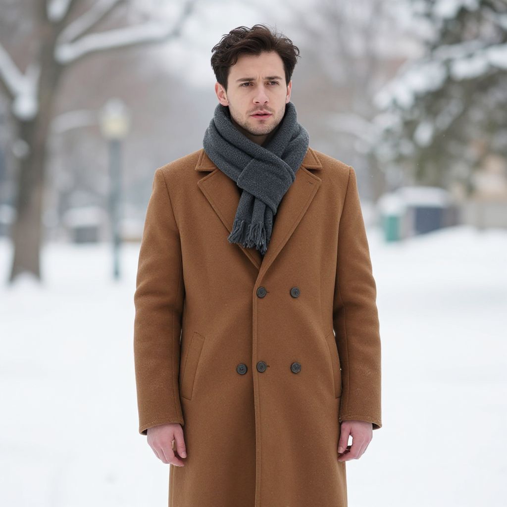 Winter Interview Costume, man in a brown coat and scarf standing in the snow