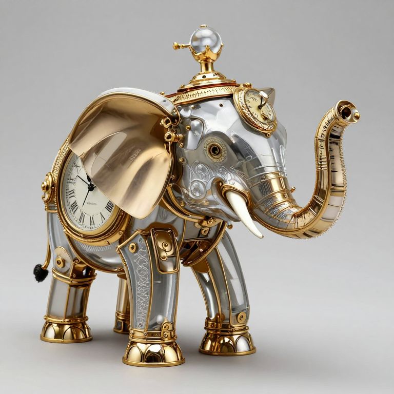 Photorealistic digital artwork of a mechanical, golden and silver elephant with clock faces, ornate gold trim, and a glass orb on its head,
