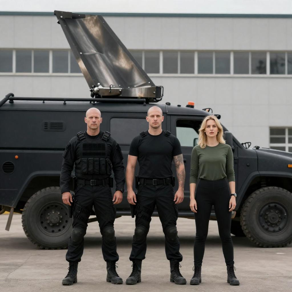 Photograph of three people standing in front of a damaged, black military-style truck with a large, metallic tail fin in the background. The two bald men wear black tactical gear, while the woman with blonde hair wears a green long-sleeve top and black pants. The background features a gray, industrial building with large windows.