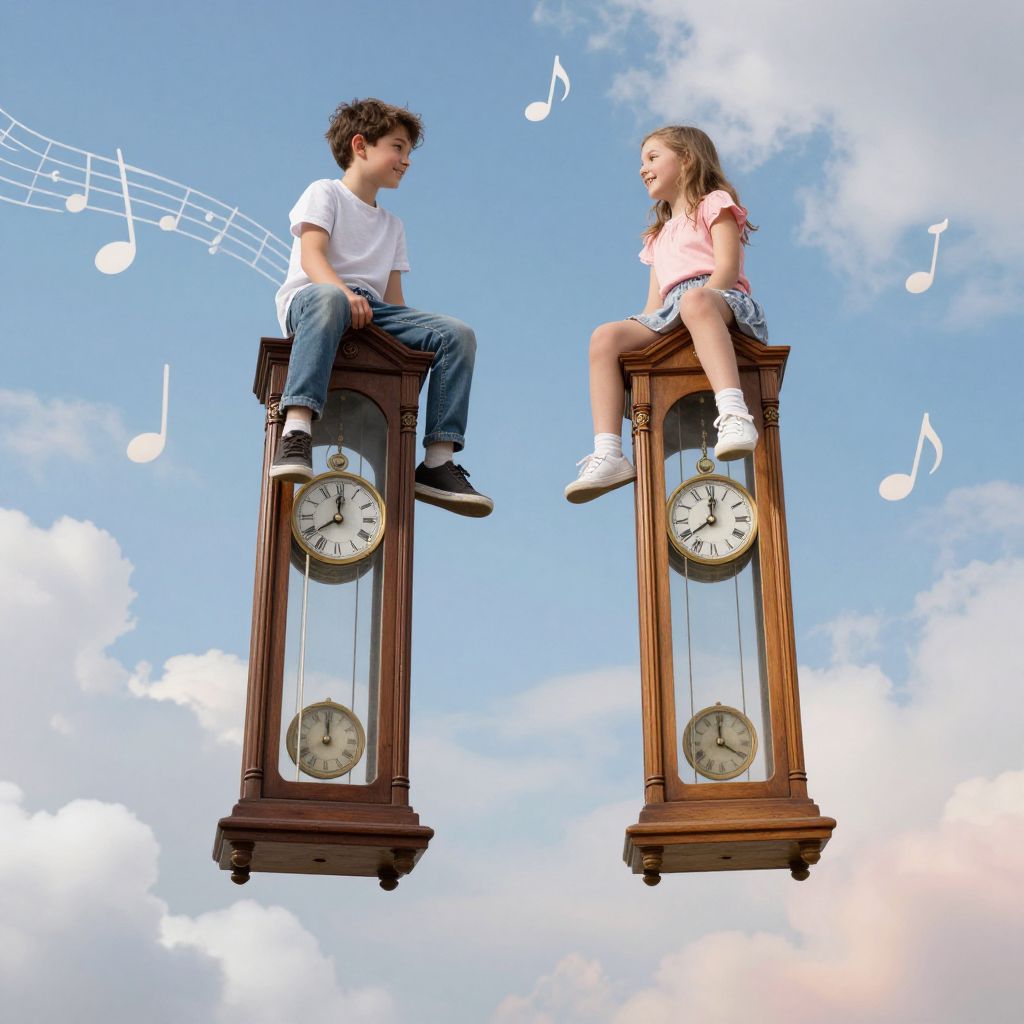 Two children joyfully perch on the tops of antique wooden pendulum clocks suspended in mid-air, soaring through a whimsical sky adorned with floating musical notes and ethereal clouds.