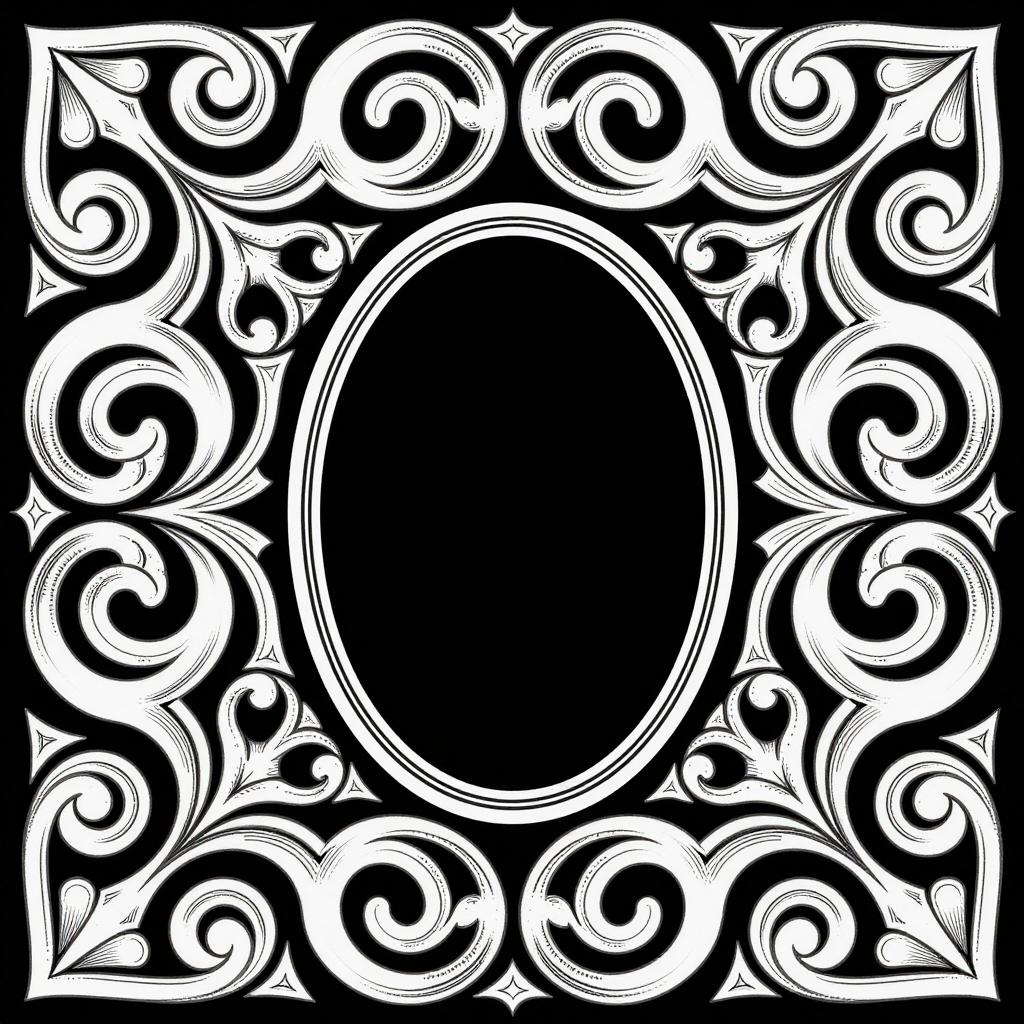 Scrollworks pattern featuring engraved gunstock-style scrolls with tight spirals and shading in high-contrast white scrollwork on jet-black arranged as complex frame of scrollwork leaving an oval center blank on richly textured fabric or wallpaper rendered as vector art with clean crisp edges and flat fills, ultra-detailed, sharp ornamental design, high resolution, intricate decorative pattern art