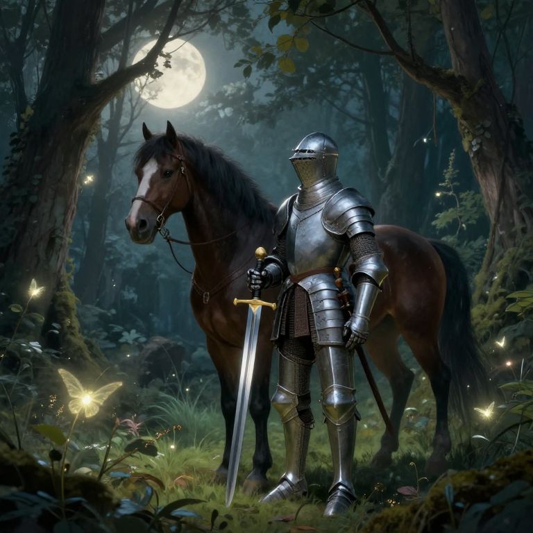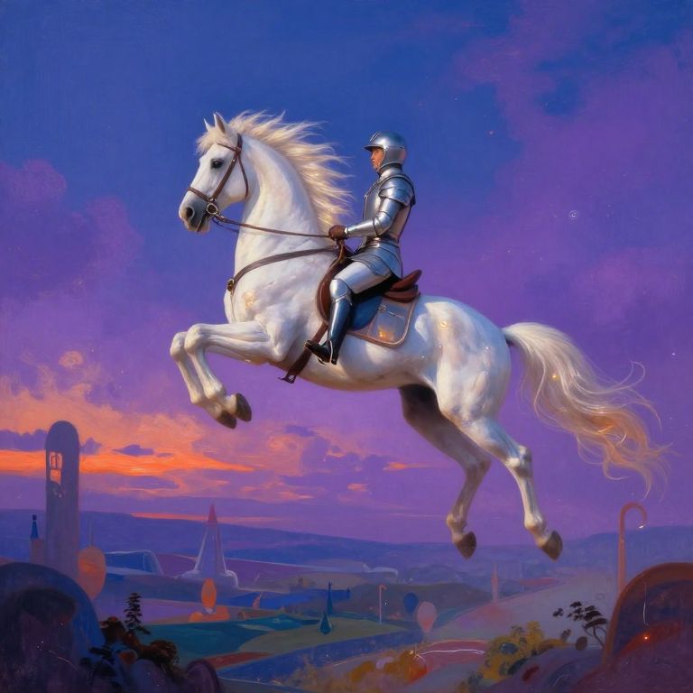 Digital art: A silver-armored knight with a glowing sword rides a silver, ornate horse through a vibrant, fantastical landscape under a starry