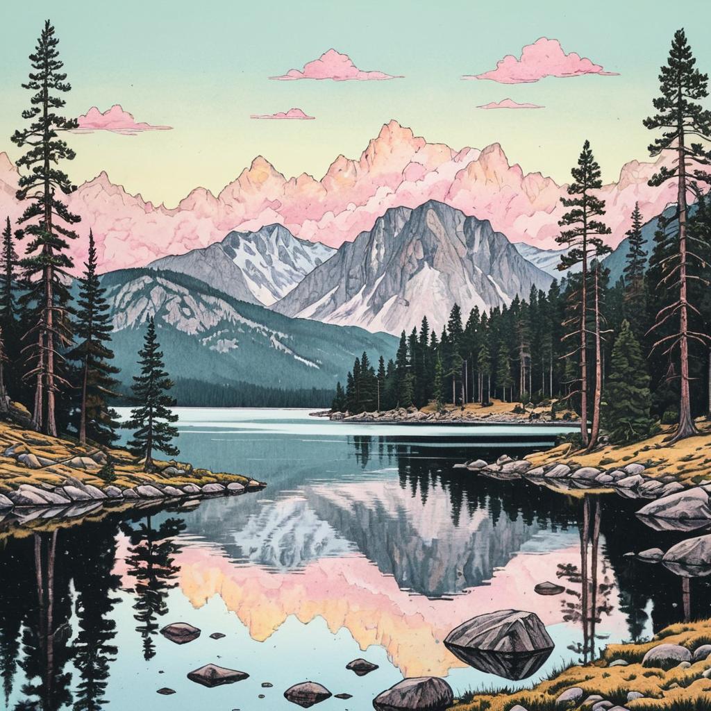 A serene mountain landscape with tall pine trees, a calm lake in the foreground, towering rocky mountains with patches of snow, pastel-colored sky with pink and yellow clouds, drawn in a line art style with pastel colors, hand-drawn illustration with soft shading and calm natural tones