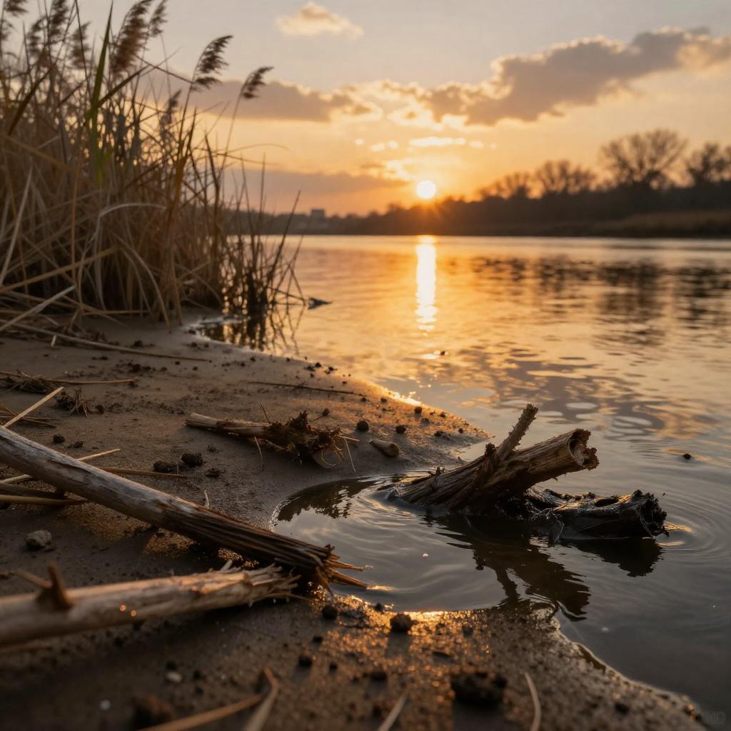 Sinking mud on a riverbank, golden sunset lighting, reflecting sky colors, reeds and fallen branches, surreal fantasy environment, rich textures, painterly style
