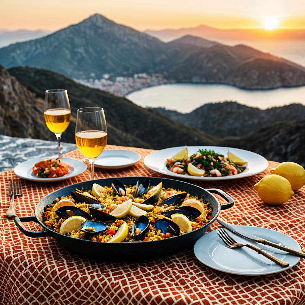 Table with Mediterranean tile tablecloth, sunset background, Greek salad on the dish, olive oil dressing, elegant cutlery, blurred sunset, high quality digital art, warm sunset lighting, detailed fabric texture, warm tones, Greek flag, sunset on the horizon