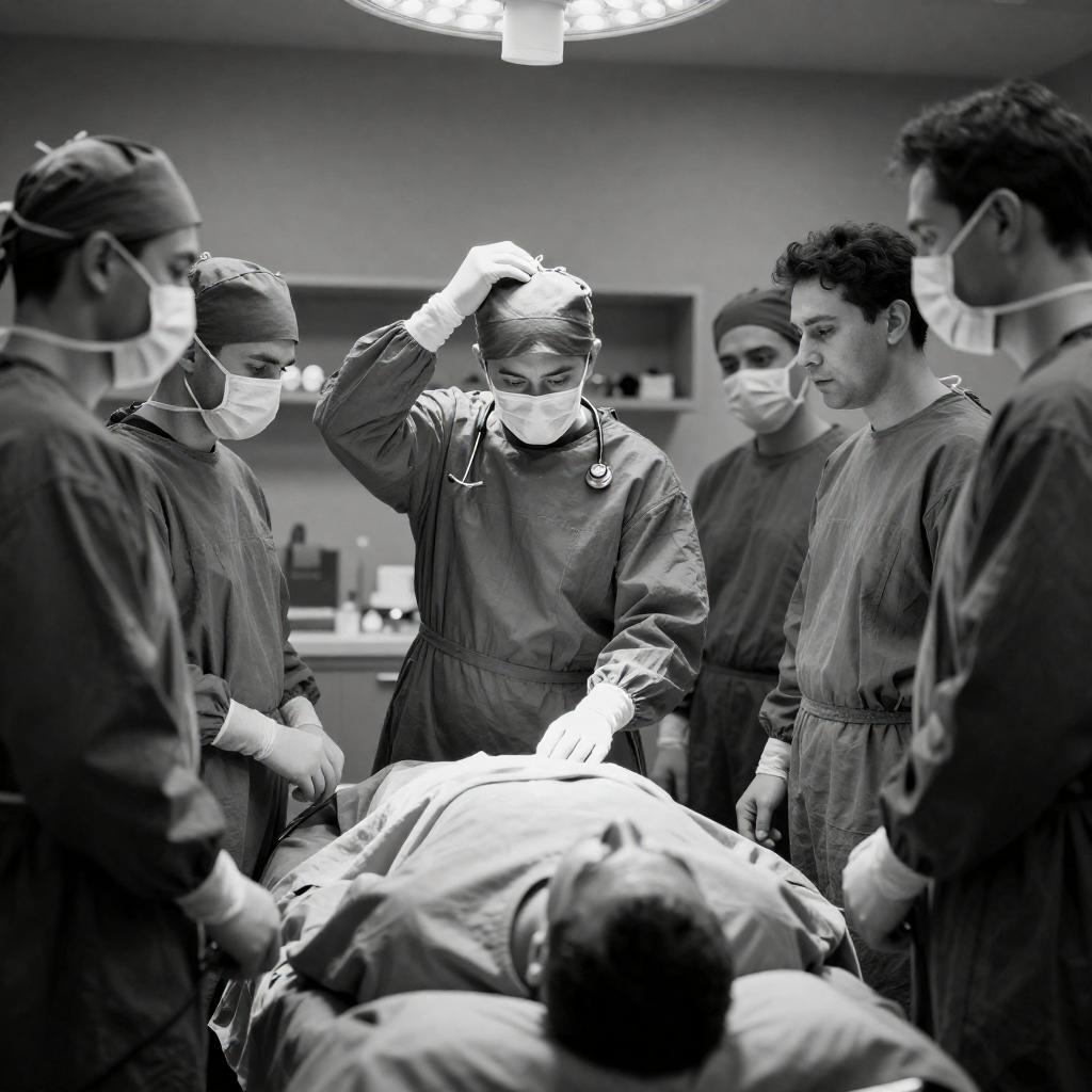 Black-and-white photograph of a surgical scene. Six men in dark robes, one holding a cloth over his head, another standing over a patient on a table, one with a stethoscope. Patient lying down, eyes closed. Background includes shelves with medical tools. Intense expressions on men.