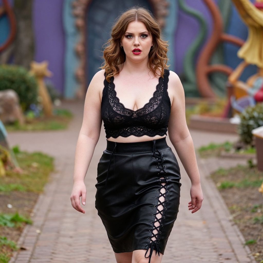 A Plus-size woman, edgy chic, in a black lace crop top with scalloped edges and a high-waisted faux leather skirt with lace-up sides, depicted in the visual style of Gottfried Helnwein. She is walking along a Wonderland path with changing colors, her expression curious and intrigued. Sexy. Pretty face and beаutiful eyes. Big breasts