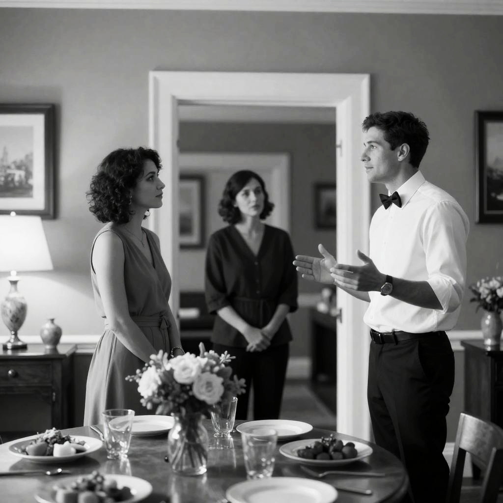 Black and white photograph of three people in a kitchen. Young man with slicked-back hair, standing, leans towards woman with wavy hair, wearing ruffled dress, holding tray. Older man with glasses, balding, crossed arms, stands to the right. Woman looks up at young man. Sunlit window in background. Decorative plates on wall. Kitchen counter and chair in foreground.