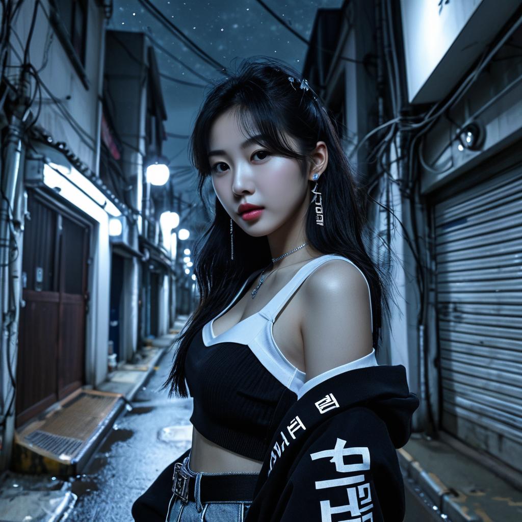 1girl, Korean, kpop idol, 20yo, look at viewer, streetwear outfit, alley, beautiful detailed face, night sky, gloomy light, bust shot