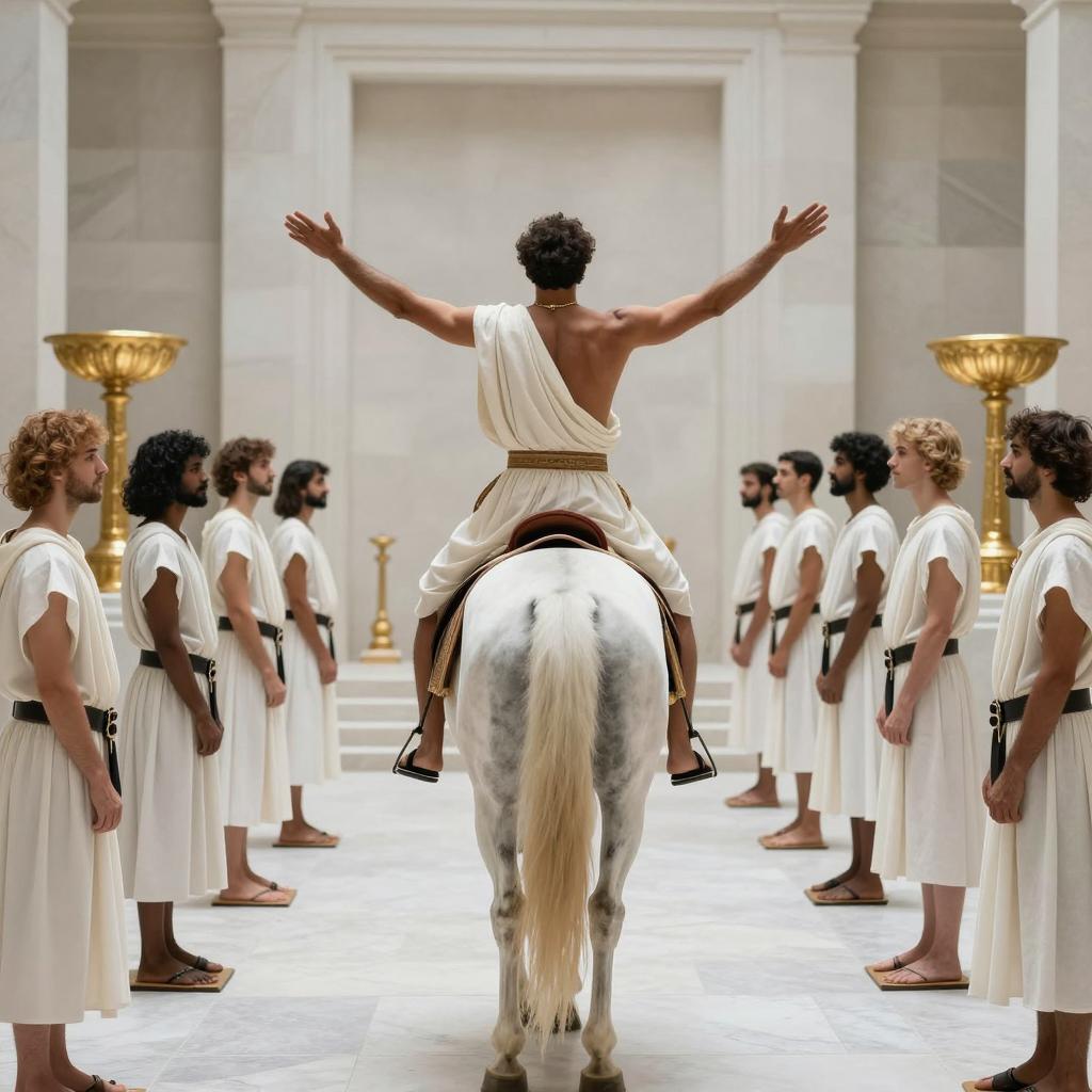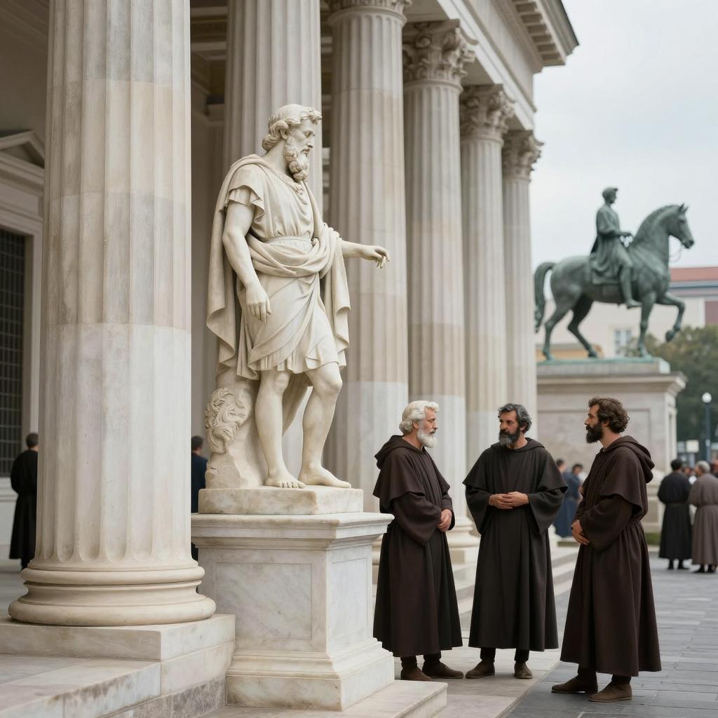 Classical architectural scene with tall, fluted columns. White marble statue of an elderly man with long beard stands on a pedestal. Three men in dark robes, two standing, one seated, stand nearby. Background: crowded plaza, people in similar dark robes, large statue of a horse. Soft light, realistic style.