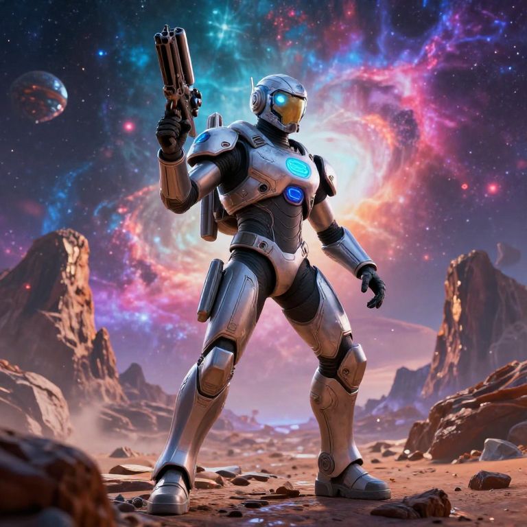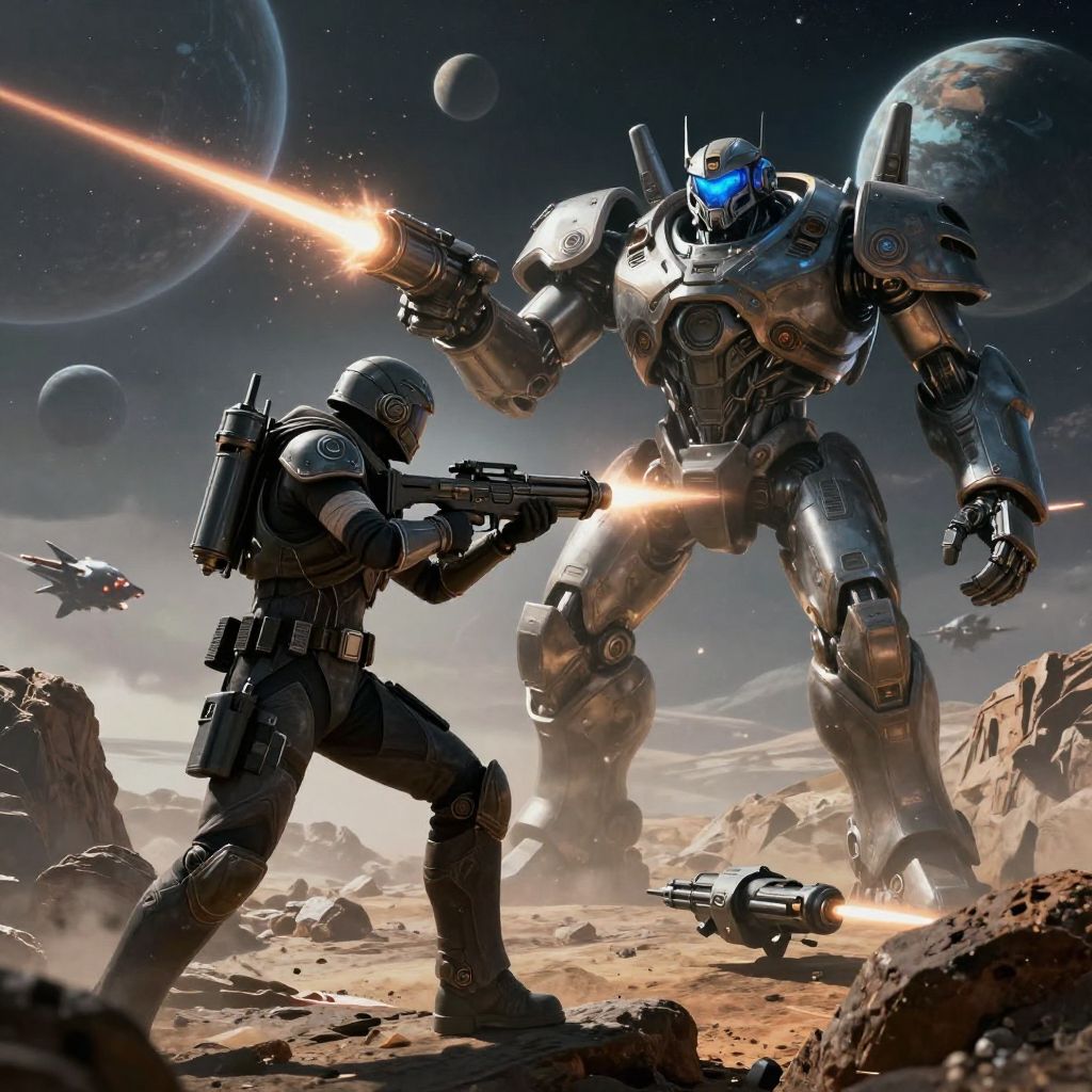 A dynamic digital CGI image depicts a futuristic space battle. A smaller, humanoid soldier in black armor, wielding a glowing blue rifle, stands in a crouched stance, firing at a towering, heavily armored robot with a glowing blue visor. The robot, with a silver and black metallic body, returns fire with a bright orange laser beam. They are on a rocky, desert-like planet with two large planets in the starry sky. In the background, a flying drone hovers, adding depth to the intense, action-packed scene. Dust and debris are kicked up around their feet, emphasizing the combat's intensity.