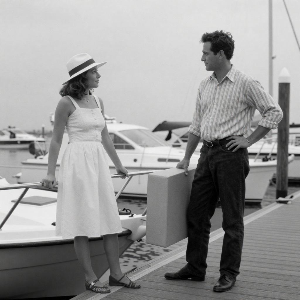 Black-and-white photograph of a man in a striped shirt and dark pants standing on a dock, holding a large rectangular object, looking at a woman in a white dress and hat, standing on a boat. The background shows a marina with several boats. The woman leans on the boat's railing, and the man's hand rests on his hip.