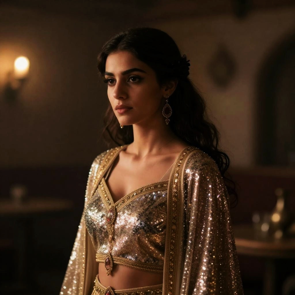 Photograph of a young woman with long, wavy black hair and olive skin, standing in a dimly lit, warm-toned room. She wears a sparkly, gold, sequined top with a deep V-neck, adorned with intricate beadwork and a matching cape. Her large, dangling earrings catch the light. The background is blurred, with soft, ambient lighting from wall-mounted sconces and dark, indistinct furnishings. Her expression is serious and focused, with dramatic makeup highlighting her dark eyes and full lips. The overall mood is elegant and mysterious.