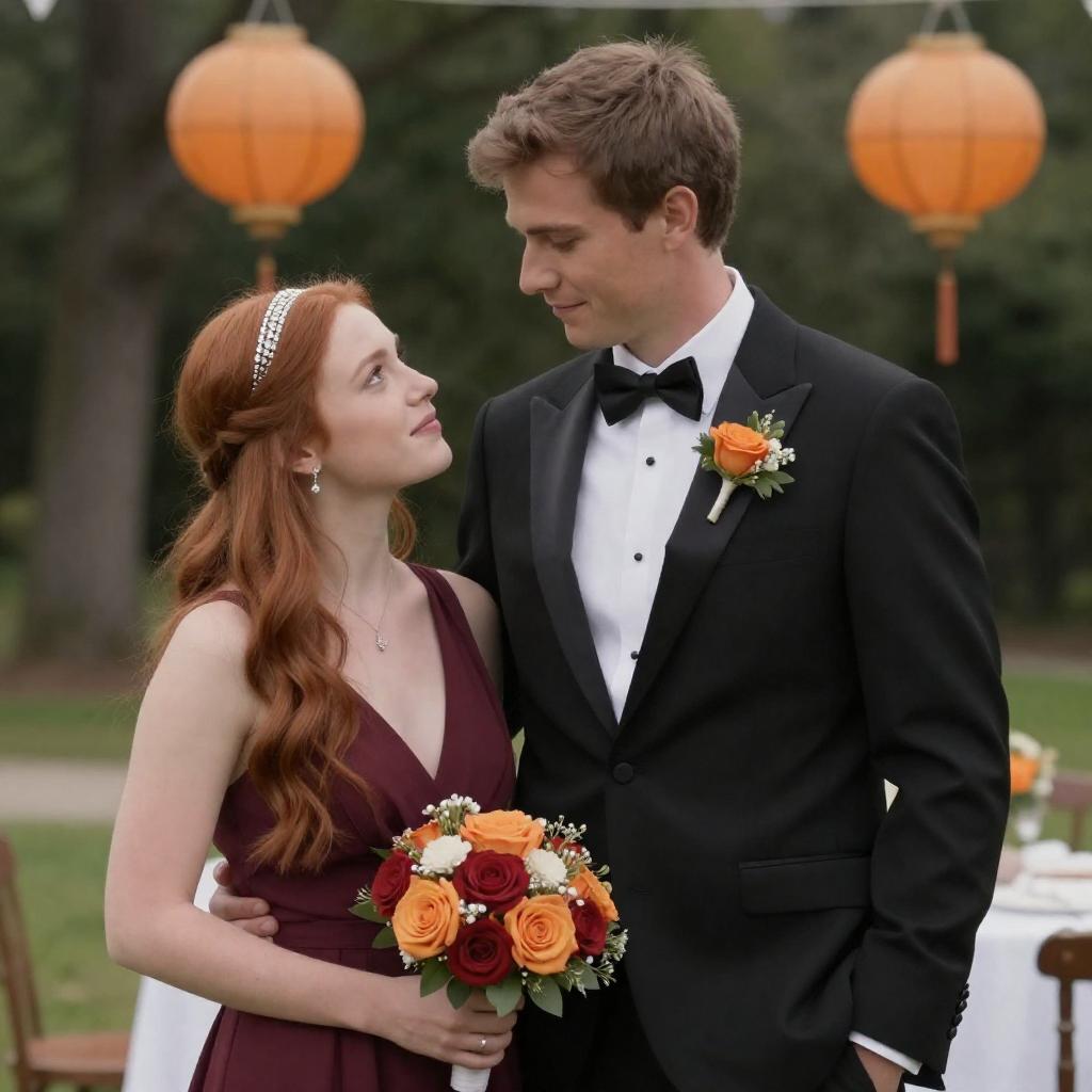 Photograph of a smiling couple in a rainstorm. Woman with red rose-patterned dress, light brown hair in a bun, laughing, eyes closed. Man with short red hair, light blue shirt, dark tie, smiling, face close to her cheek. Green blurred background. Raindrops visible. Woman's hand on her cheek. Close-up shot.