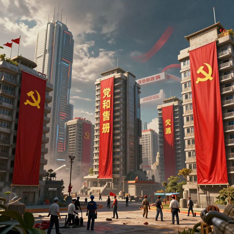 Communism themed futuristic cityscape, towering communal buildings, workers in harmony, vibrant red banners, banners with hammer and sickle symbols, a blend of socialist realism and cyberpunk aesthetics, dramatic sky with revolutionary slogans, ultra detailed, cinematic lighting