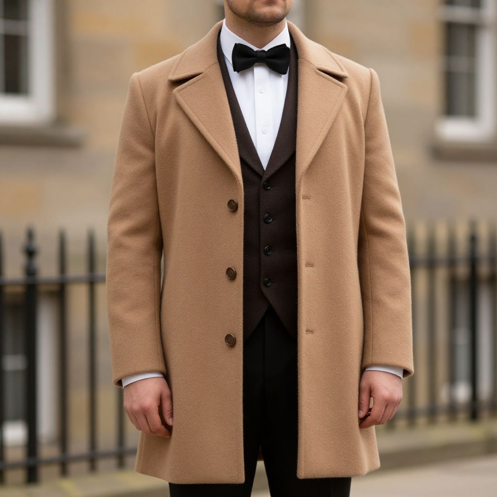 "Victorian Fashion Male Costume, man in a tan coat and bow tie standing in front of a stone building"
