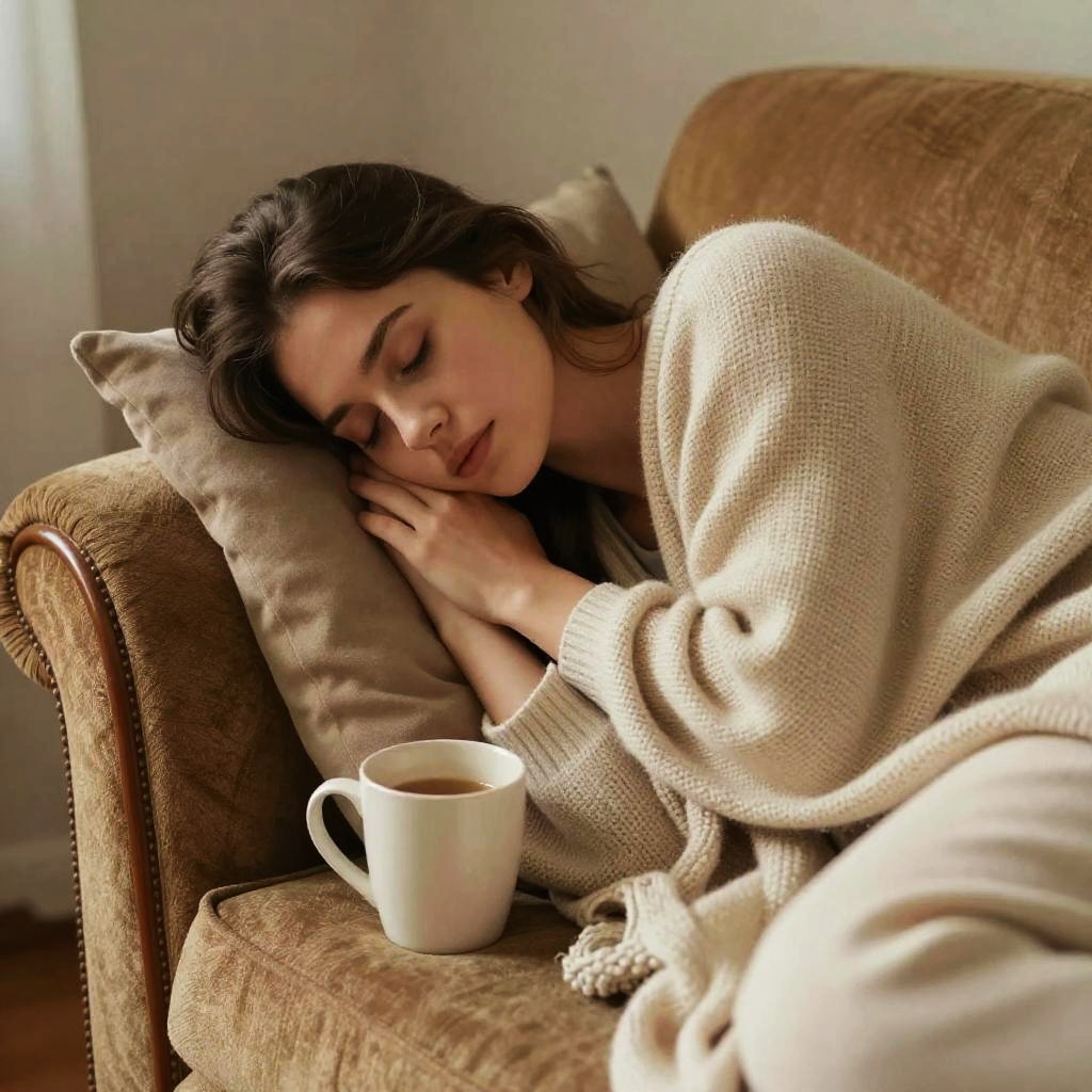 Mujer durmiendo profundamente en un sofá vintage, con mantas tejidas y una taza de té al lado, estilo acogedor y cálido, iluminación natural suave y textura realista.