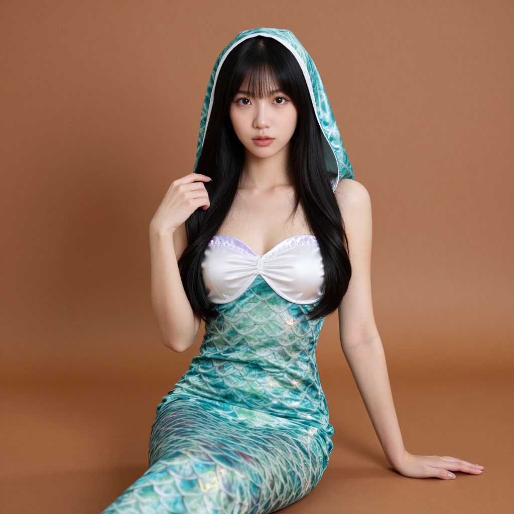 Photograph of an Asian woman with long black hair and fair skin, seated against a plain brown background. She wears a mermaid-like costume with a turquoise and white patterned hood, a white strapless top with a bow, and a matching textured skirt. Her right hand gently touches the hood, and her left arm rests on the ground. She has large, dark eyes and a neutral expression. The costume's fabric appears shiny and slightly iridescent. The lighting is soft, highlighting her features and the costume's texture. She exudes a serene, slightly mysterious aura.