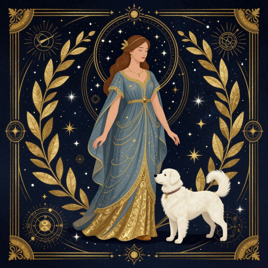 A detailed, celestial illustration featuring a woman in a flowing blue and gold dress, accompanied by a white dog, set against a starry night sky with intricate gold leaf designs and celestial motifs.