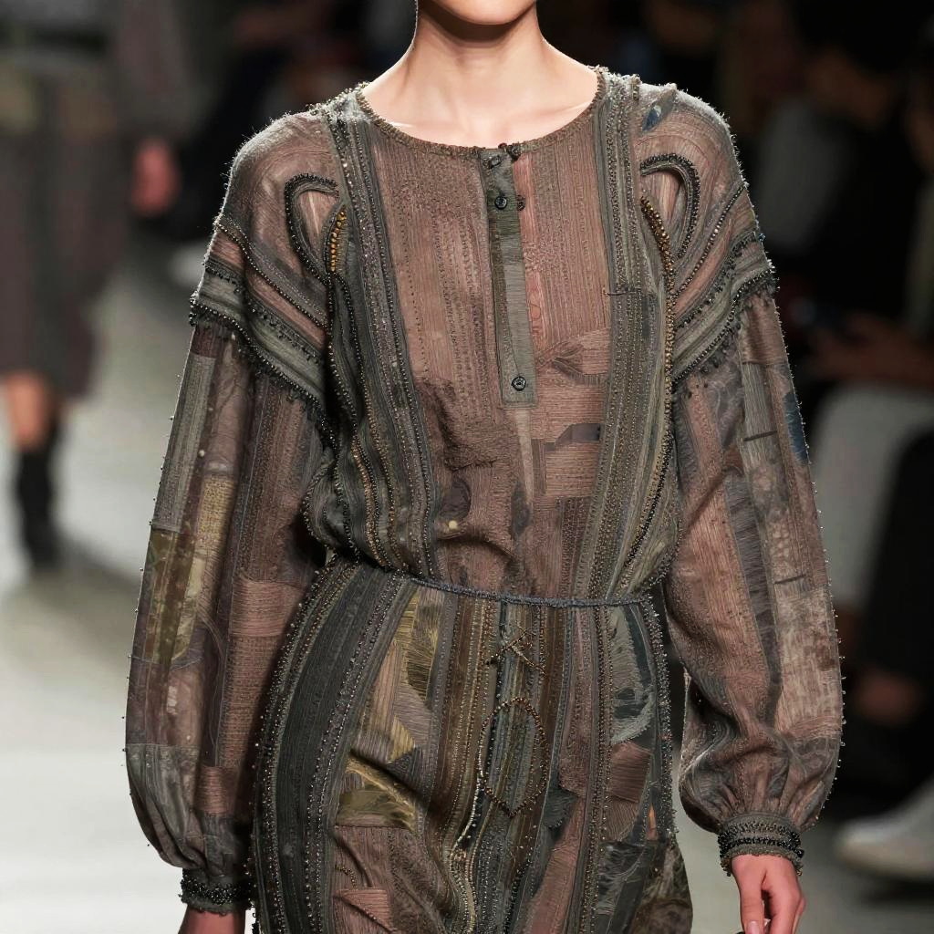 Intricate clothing composed of layered fabrics and delicate beadwork, captured on a model walking a runway with dramatic lighting, fashion editorial style, realistic fabric texture.