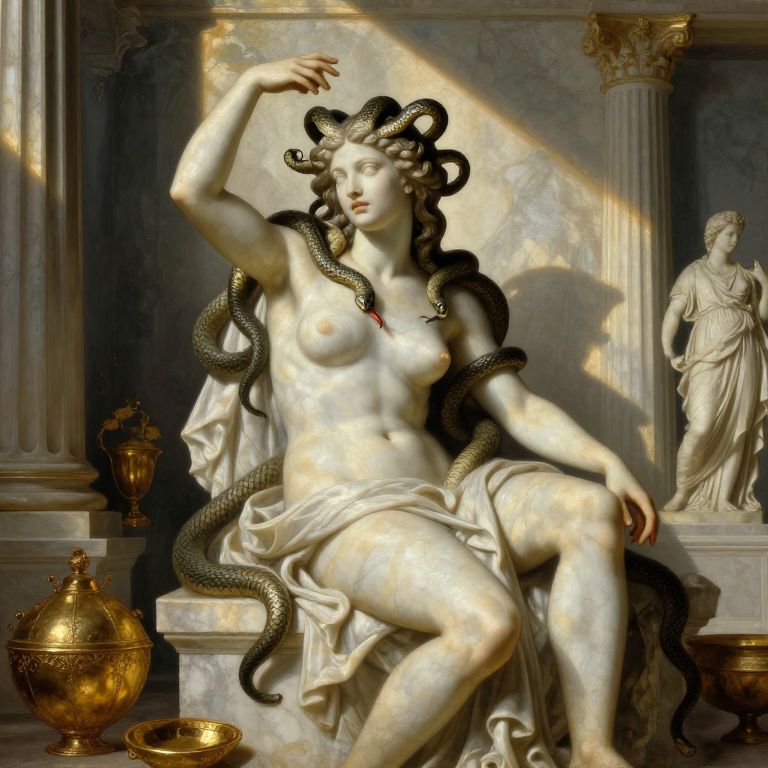This digital artwork depicts a classical marble statue of a nude, fair-skinned woman with dark, curly hair adorned with black serpents. She sits on a pedestal, one arm raised and the other resting on her lap, partially covered by a draped white cloth. She has small breasts and a slender, yet curvaceous physique. Sunlight streams through columns in the background, casting dramatic shadows. To her left, a golden ornate vase and a brass bowl sit on a stone platform. On the right, a smaller statue of a draped woman stands in the background. The scene exudes a classical, mythological aura.