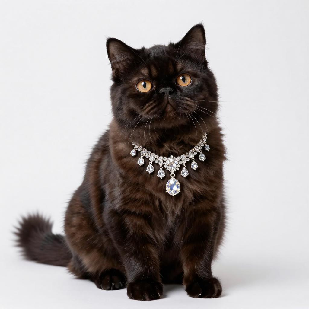 Luxurious studio portrait of a Persian cat sitting upright, glossy dark fur, wearing an ornate sparkling diamond necklace, clean white background, high-end fashion pet photography, high resolution, ultra-detailed