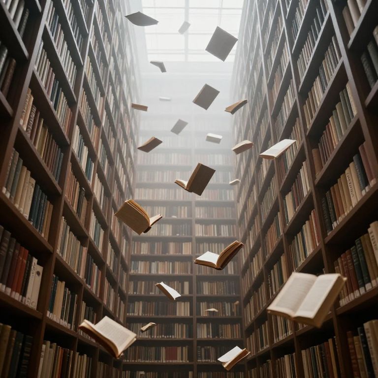 Books float ethereally between towering shelves in a misty library, their pages fluttering as if animated by unseen hands, creating a surreal and enchanting atmosphere.