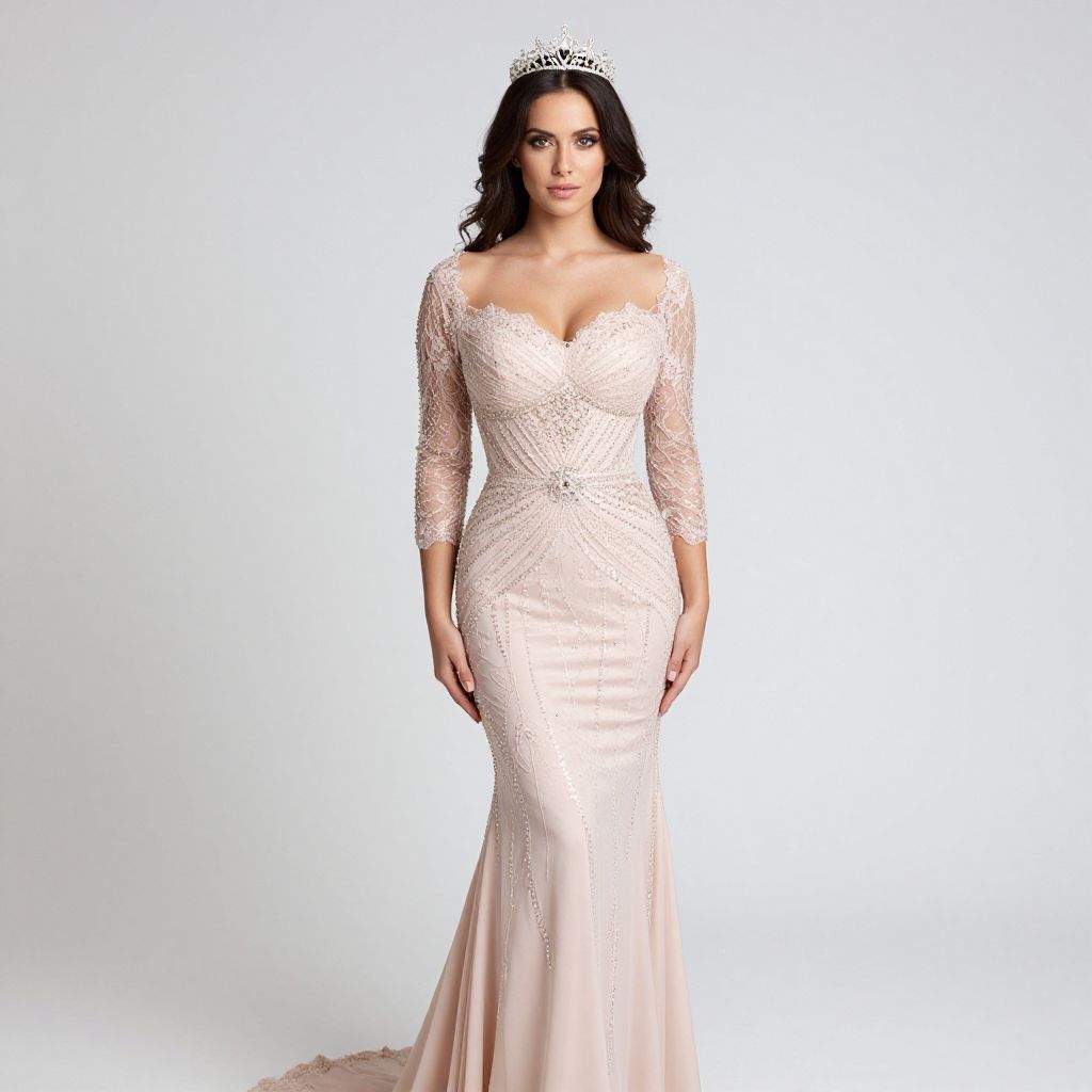 "Woman, romantic allure, fitted evening gown in blush pink, illusion sweetheart neckline, three-quarter lace sleeves, bodice adorned with sequins and beads, structured waistline, flowing skirt, slight train, silver tiara, plain white studio background.. Sexy. Pretty face and beаutiful eyes. Big breasts."