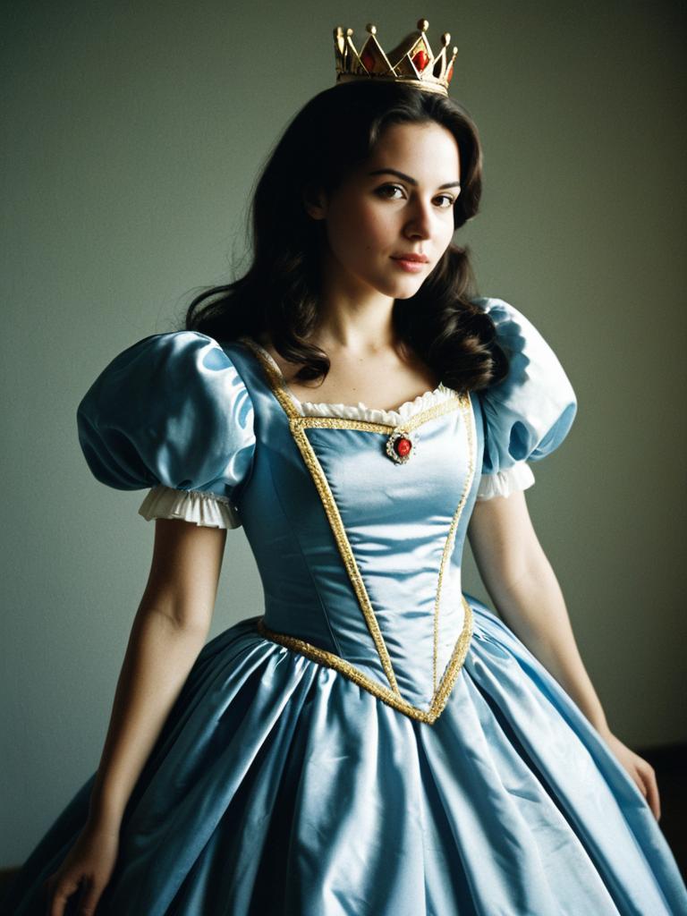 Woman in Princess Costume, waist-up editorial photo with soft shadows