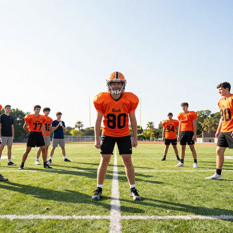 A wide-angle photo of a group of high school boys during a football practice, one of them is center stage wearing a bright orange football jersey with the word 'Rush' on the front, his face glowing with determination, with the field under a bright afternoon sun and goalposts in the distance.