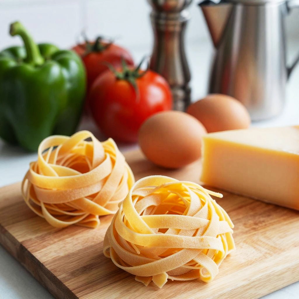 This close-up photo shows a wooden cutting board with uncooked fettuccine pasta, two brown eggs, and a wedge of cheese. In the background, there's a red tomato, a green bell pepper, a stainless steel pepper grinder, and a shiny kitchen pitcher. The colors are vibrant, with a warm, cozy kitchen vibe. The image has a slight blur effect.