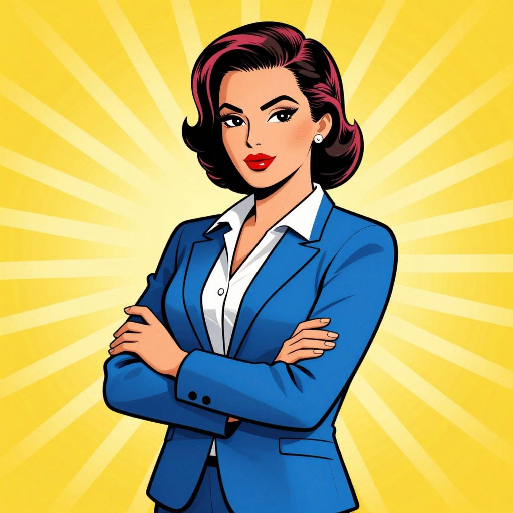A confident businesswoman in a retro pop art style, illustrated with vibrant colors and bold lines, exudes strength and professionalism against a radiant yellow background with sunburst effects.