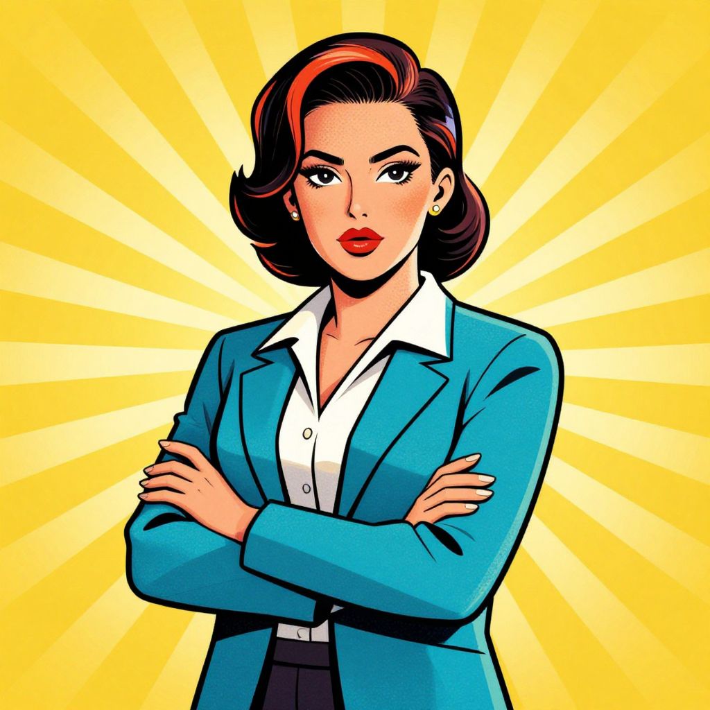 Vintage-style comic illustration of a confident woman with red lipstick, blue suit, white shirt, and crossed arms, set against a yellow radiating background.
