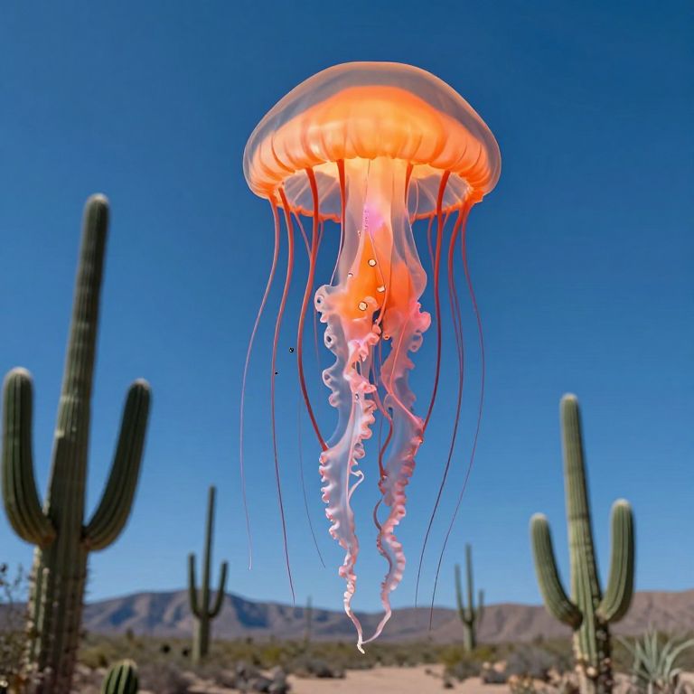 Photograph of a vibrant orange jellyfish with translucent, wavy tentacles floating against a clear blue sky. The jellyfish is centered in the image, surrounded by tall, green cactus plants in the desert landscape below. The background includes distant, rugged mountains under bright sunlight, creating a stark contrast with the jellyfish's luminous, soft texture. The cacti are spaced evenly, with three on the left and two on the right, adding depth and context to the arid setting. The jellyfish's delicate, flowing tentacles stand out against the desert's sharp, spiky cacti.