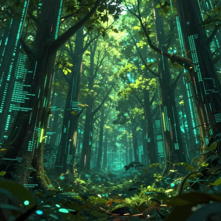 This digital artwork depicts a mystical forest bathed in ethereal light. Towering trees with dark, textured bark rise vertically, adorned with glowing, neon-blue and green lines that resemble digital code. Sunlight filters through the dense canopy, casting a luminous, greenish-yellow glow across the forest floor, which is covered in lush, fern-like plants. The scene combines elements of nature and technology, creating a futuristic, otherworldly atmosphere. The background fades into a misty, illuminated distance, enhancing the sense of depth and mystery. The overall color palette is dominated by greens, blues, and dark browns, with a high contrast between the glowing lines and the natural surroundings.
