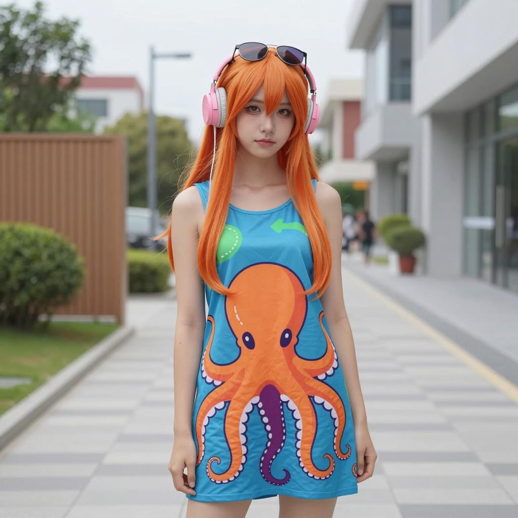 Photorealistic image of a young woman with long orange hair wearing pink headphones and a sleeveless blue dress featuring a vibrant octopus design in orange, purple, and white. She stands outdoors on a paved walkway in a modern urban setting with green bushes and contemporary buildings in the background. The woman has a slender build, light skin, and wears sunglasses on her head, with a neutral expression and slight forward gaze. The scene is captured during the daytime under an overcast sky.
