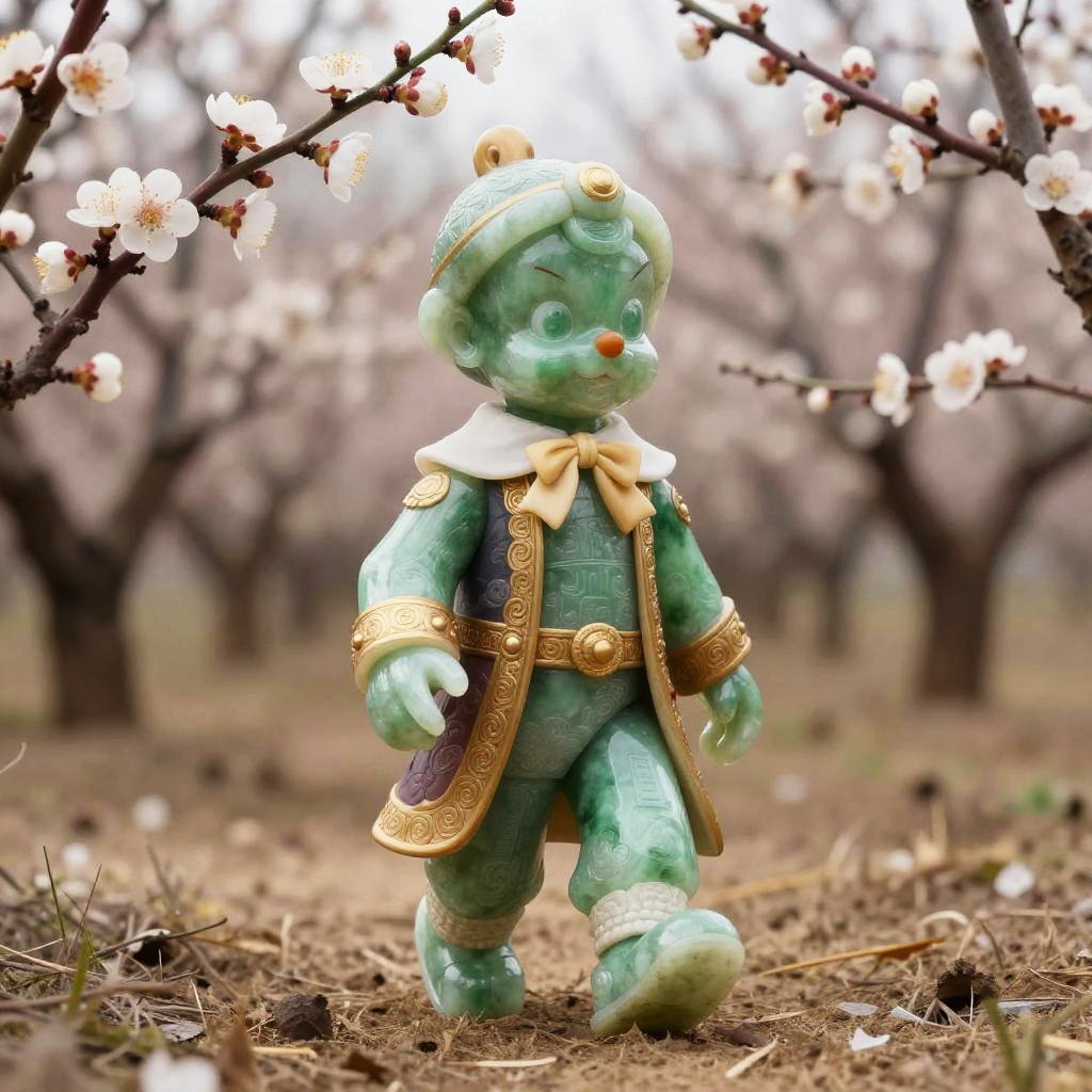 A reimagined Pinocchio with ornate cloisonné enamel instead of wood, wearing traditional russian folk costume, walking through a snow-covered village.